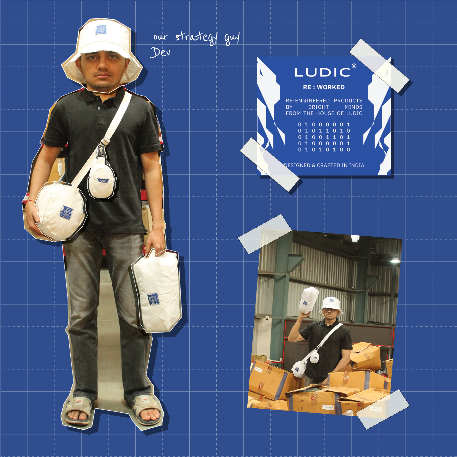Re-engineered products by bright minds from the house of ludic. Every cut rethought. Every panel reassigned. What began as a shirt now returns as something entirely new – practical, considered, and Reworked. Bucket Hat: made from the diagonal pocket, upper shoulder, front left, and upper back. Duffle Bag: features the patch pocket area and front top right. Dopp Kit: built using the lower back, collars, and seams. Coin Pouch: derived from the shoulder tops and sleeves. Each piece carries a Woven Label integrated as a visible design element. It features a binary code crediting the designer, the Ludic logo, Re:Worked tagline, and Circuit graphic.